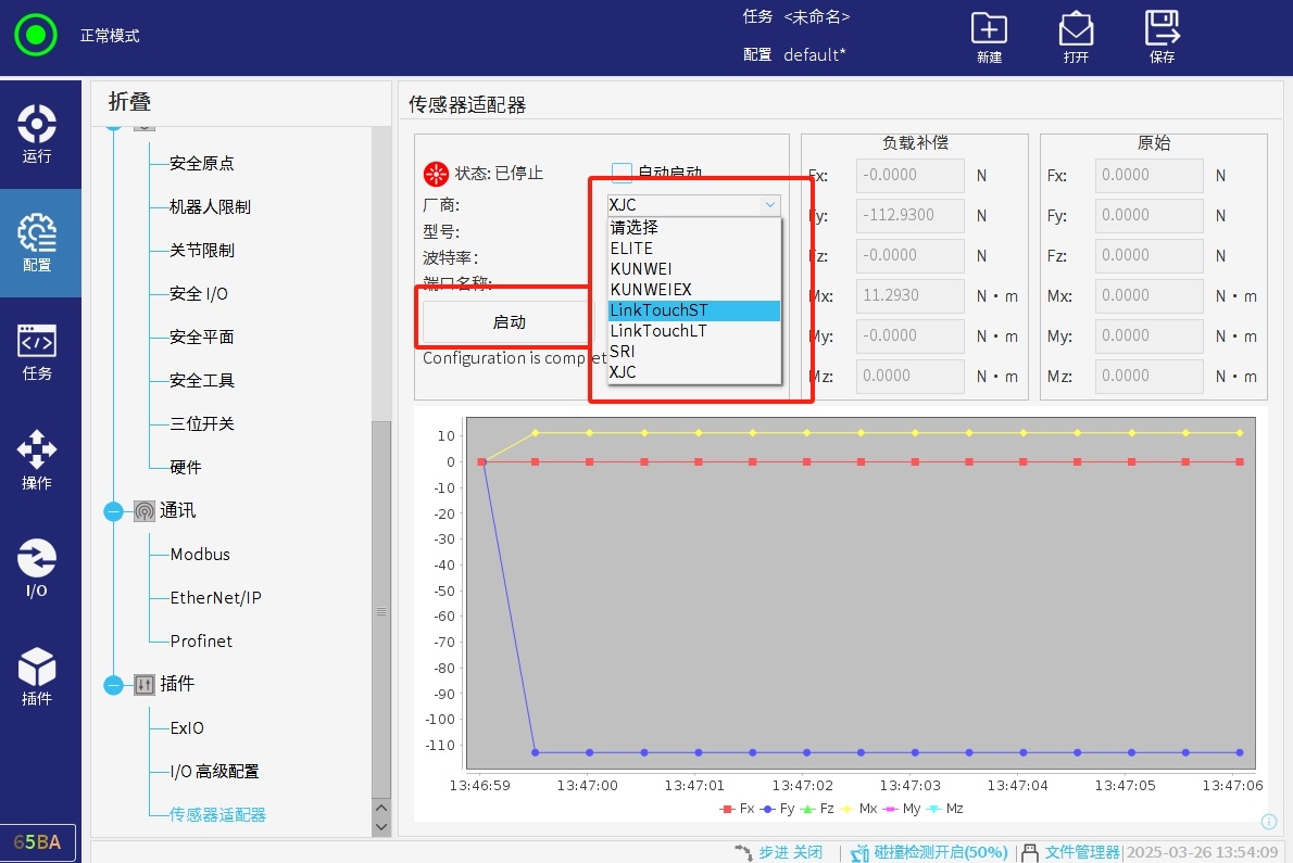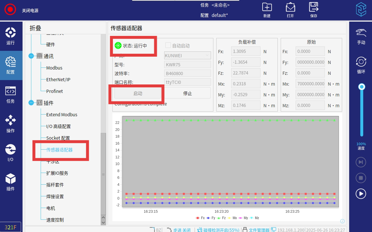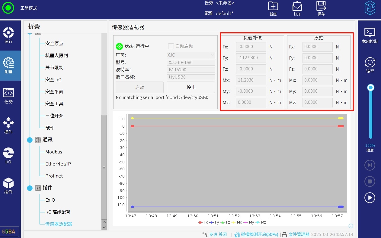 打開力控插件后,需檢查一下負載補償與原始數據,是否正常,如果不正常,需要做力傳感器標定。也可以稍微給力傳感器外部施加力,檢查負載補償是否有數據,如果沒有數據,也是說明不正常。