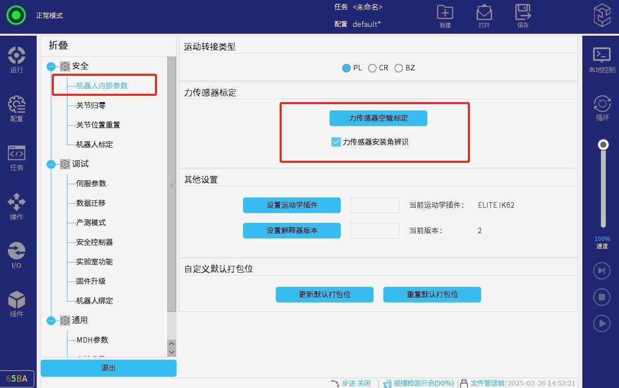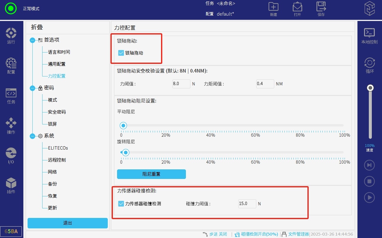 該功能需要打開力控插件,才能設置該參數,用戶可以自定義碰撞力閾值,當力傳感器末端如果感受到相應反方向的閾值的力,機械臂就會停止。