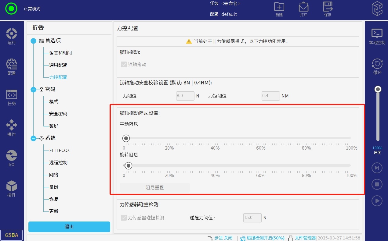 平動阻尼就是機械臂在力控模式下,朝X,Y,Z方向水平拖動時候的阻力,參數越大,拖動起來越費力。