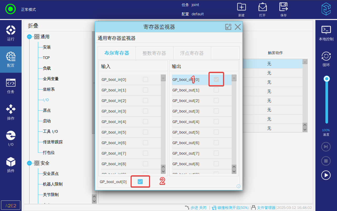 2. 布爾寄存器輸入輸出數量各128個,保留為總線通訊的輸入輸出各范圍是0-63,保留范圍外部RTSI客戶端通訊的輸入輸出范圍為64-127,(1)查看狀態,(2)輸出強制為True;