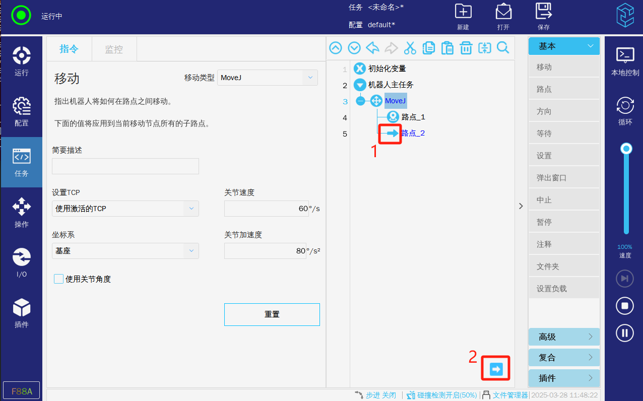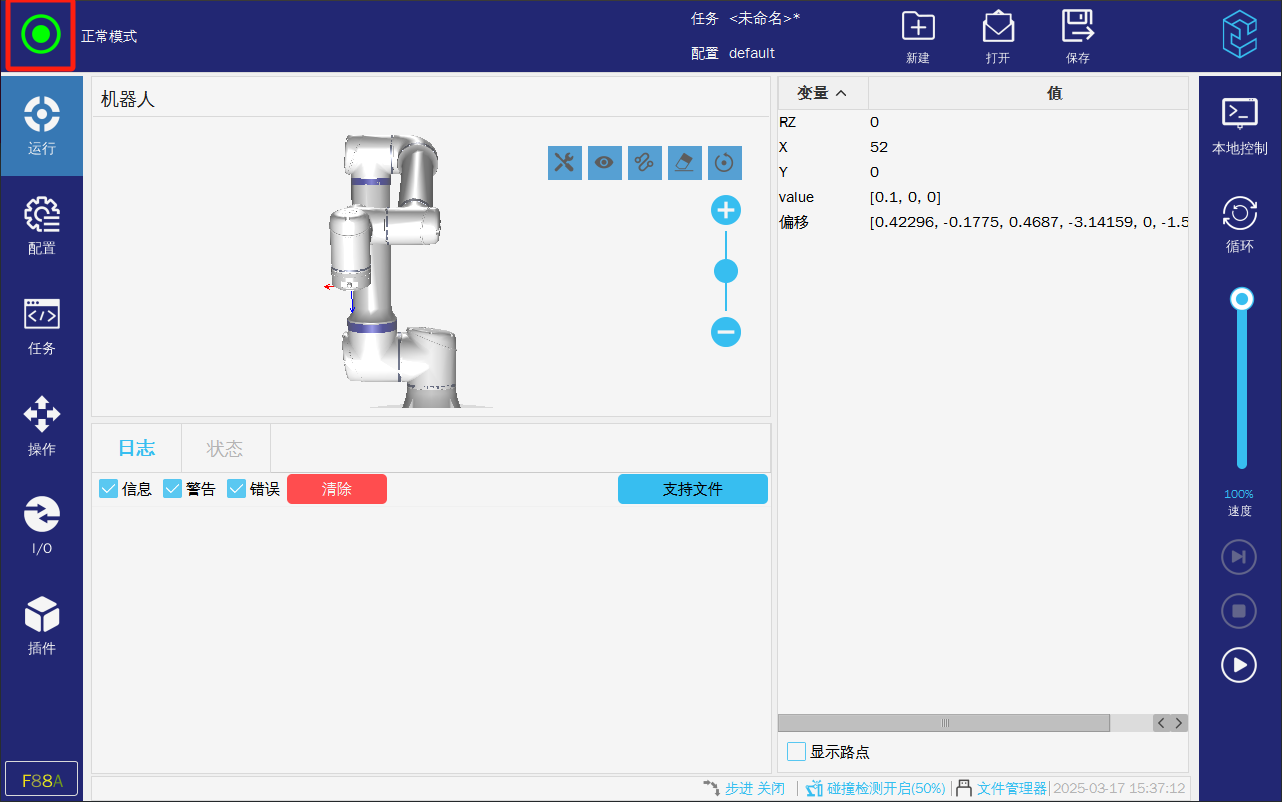 2.運(yùn)行模式,如果是正常模式則需要讓任務(wù)運(yùn)行(左上角處于“運(yùn)行中“),則機(jī)器人才會(huì)根據(jù)任務(wù)來執(zhí)行需要?jiǎng)幼鳌?/p>
