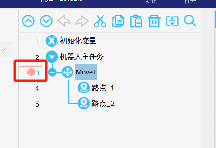 在處于任務(wù)運(yùn)行中的時(shí)候機(jī)器人如果沒有任何動(dòng)作也無報(bào)警可以查看對(duì)應(yīng)任務(wù)的程序指針,通過指針查看當(dāng)前程序執(zhí)行在哪一行(比如以上程序目前是在處于等待指令行),由此來判斷不動(dòng)作的原因。位置1是程序指針,如果找不到位置1的程序指針,可以點(diǎn)擊位置2,該位置是表示跟蹤到程序指針位置1.