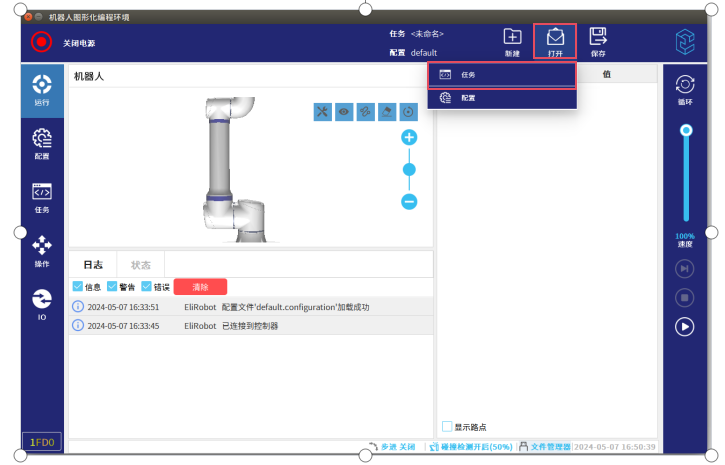 第一步:按照2.4.4操作方法選擇與備份程序相對(duì)應(yīng)型號(hào)的機(jī)器人,然后打開(kāi)虛擬示教 器