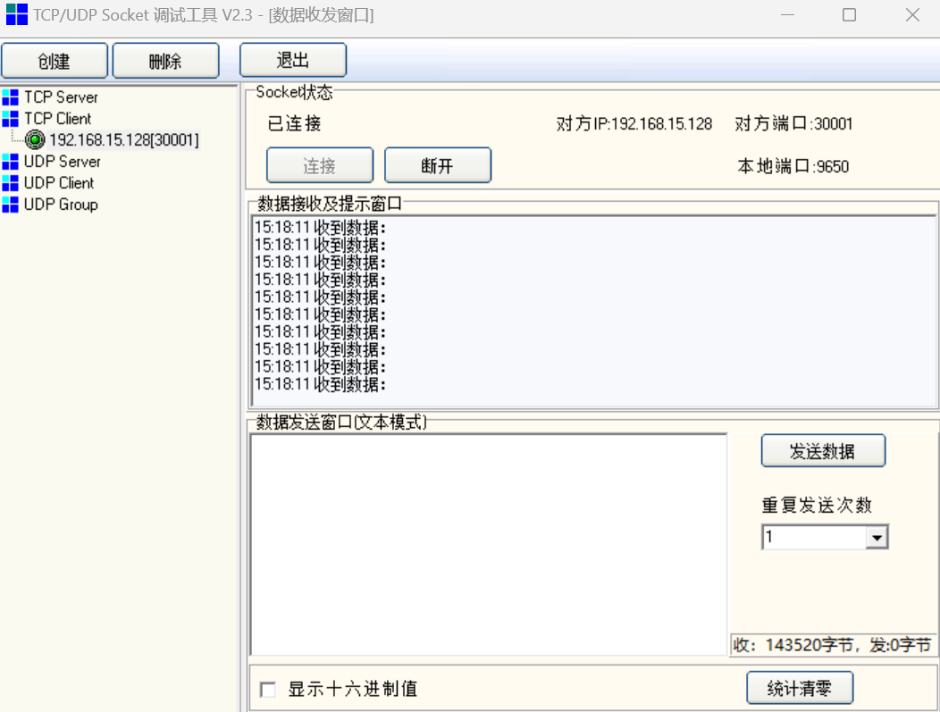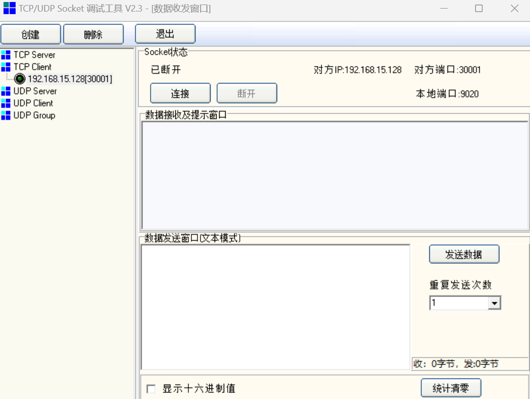 1.本機做主站,機器人做從站。在 SocketTool 軟件里,創建客戶端,輸入在 2.2 里獲取的IP:192.168.15.128 ,端口號參考用戶手冊里的二次開發端口。