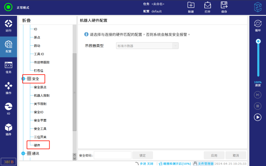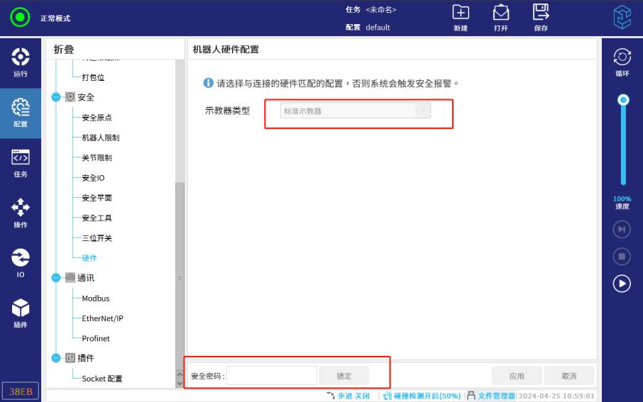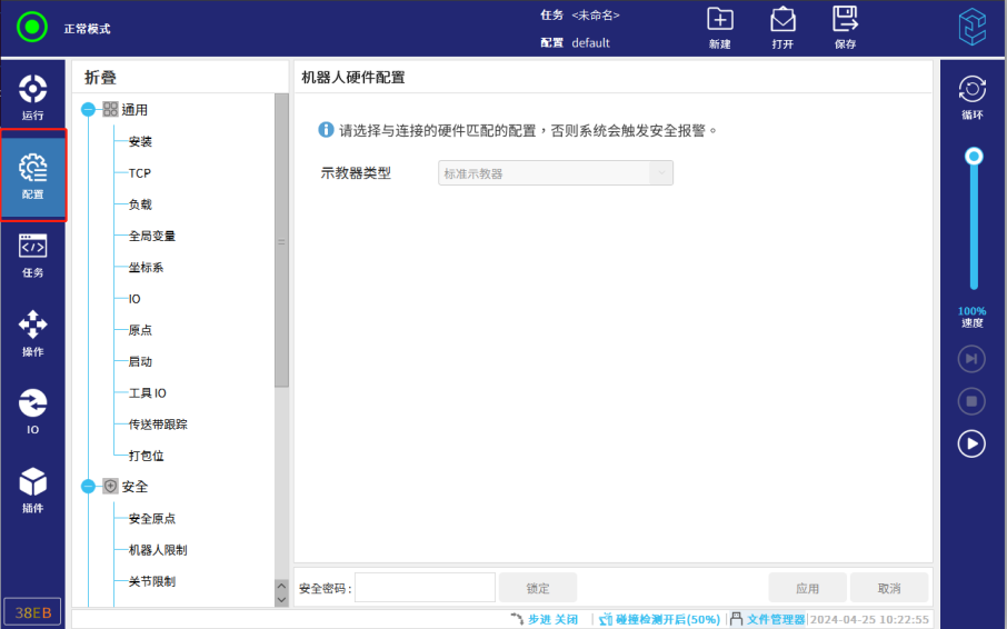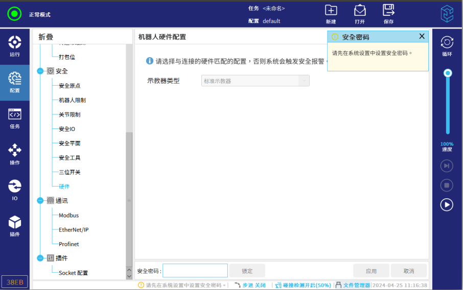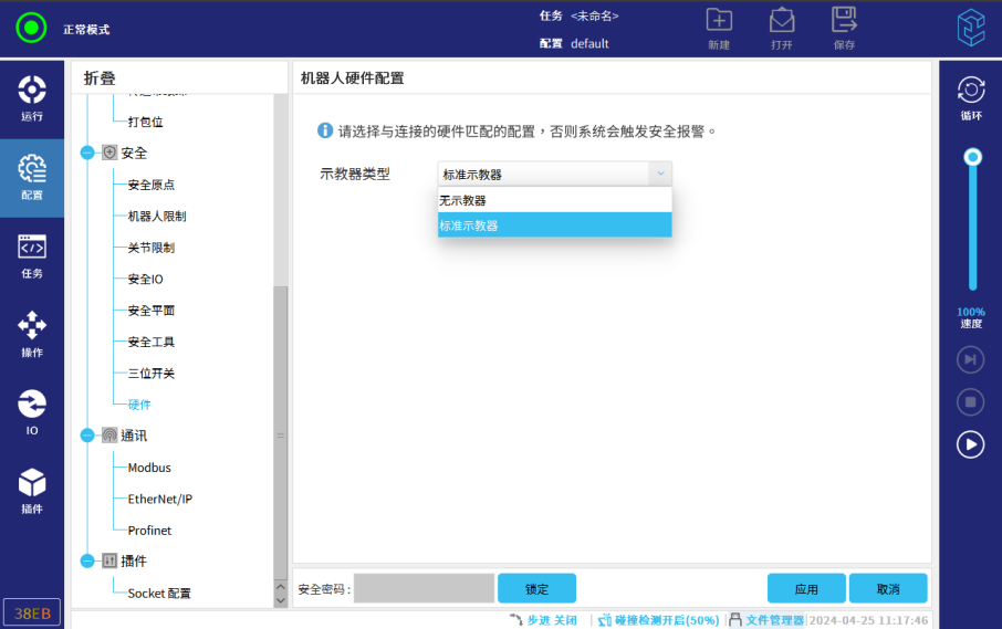 1.是否支持熱插拔:不支持,如果不在配置中設置無示教器,直接拔示教器,機器人會報錯。