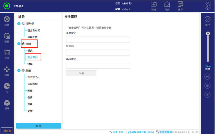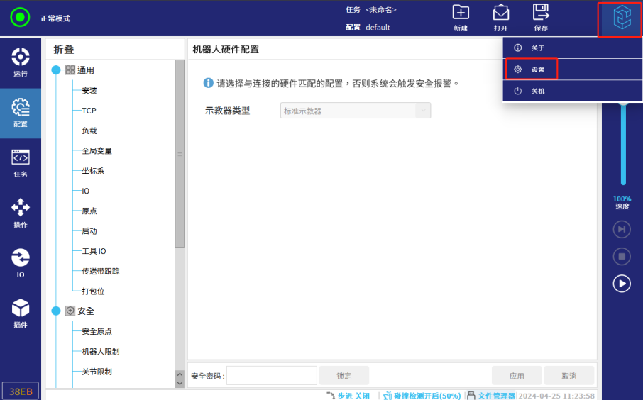 2.7. 在下方輸入安全密碼后,選擇示教器類型。(新機器人需要在設置中,先設置安全密碼。沒設置安全密碼,點擊密碼框,會提示請在系統設置中設置安全密碼。如果沒有該提醒,可以直接輸入密碼,請詢問現場人員,設置的安全密碼)