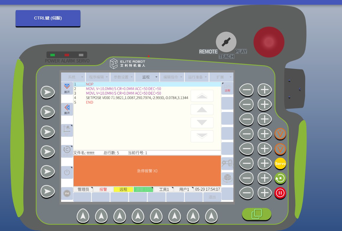 如下圖為機(jī)器人拔除示教器后未屏蔽示教器急停,有急停報(bào)警X0異常