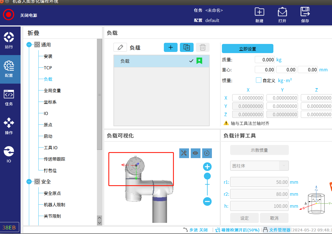 第七步:按下示教器頂部自由拖動按鈕,機器人末端三色燈亮藍燈且機器 人沒有動或者有一點微動那就說明負載以及重心就設置正確;如 果機器人往下掉或者往上抬那就說明質量沒有設置正確,如果機 器人往X,Y,Z三個方向的某一個方向偏那就說明重心沒有設置正確。