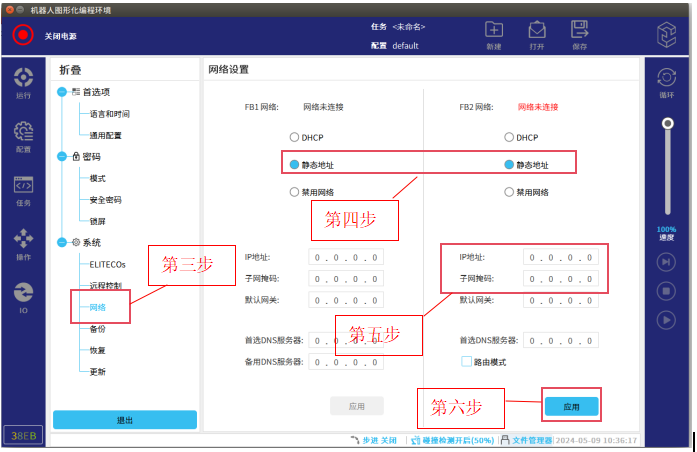 3.1設置IP時在使用機器人FB2網口時可能會出現FB網口始終處于未連接狀態,這時就需要重啟一下示教器。