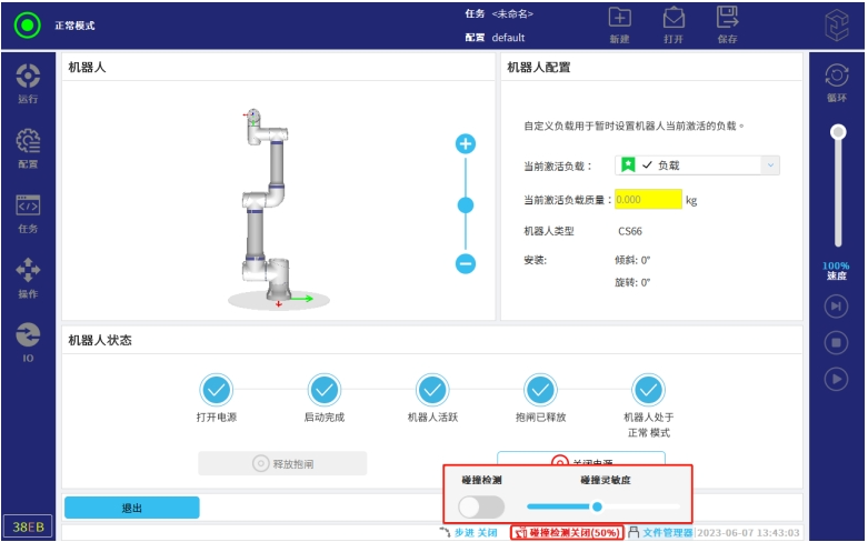 值得注意的是,如果使用方法三設置碰撞靈敏度,該值只會在開發者模式里面顯示,不會在示教器界面下方的碰撞檢測實時刷新(重新點擊碰撞靈敏度界面,再關閉,才會刷新)。
