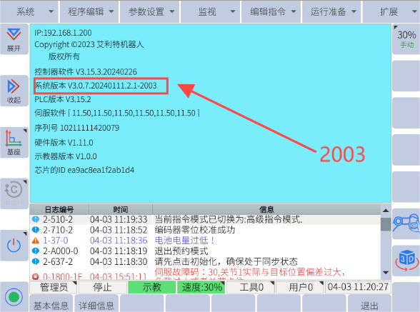 網頁版示教器適用的控制柜主板版本為“-2003”款的版本,如果是“-1000”款的版本,是無法連接網頁版示教器的。查看方式:系統-----系統信息-----詳細信息-----系統版本號后綴。如圖: