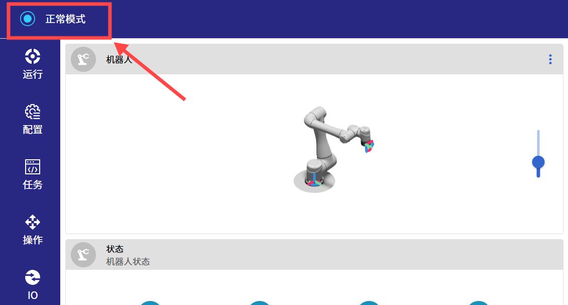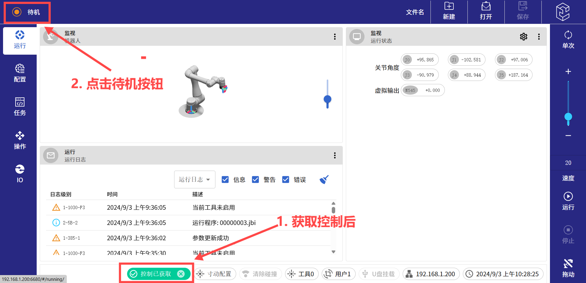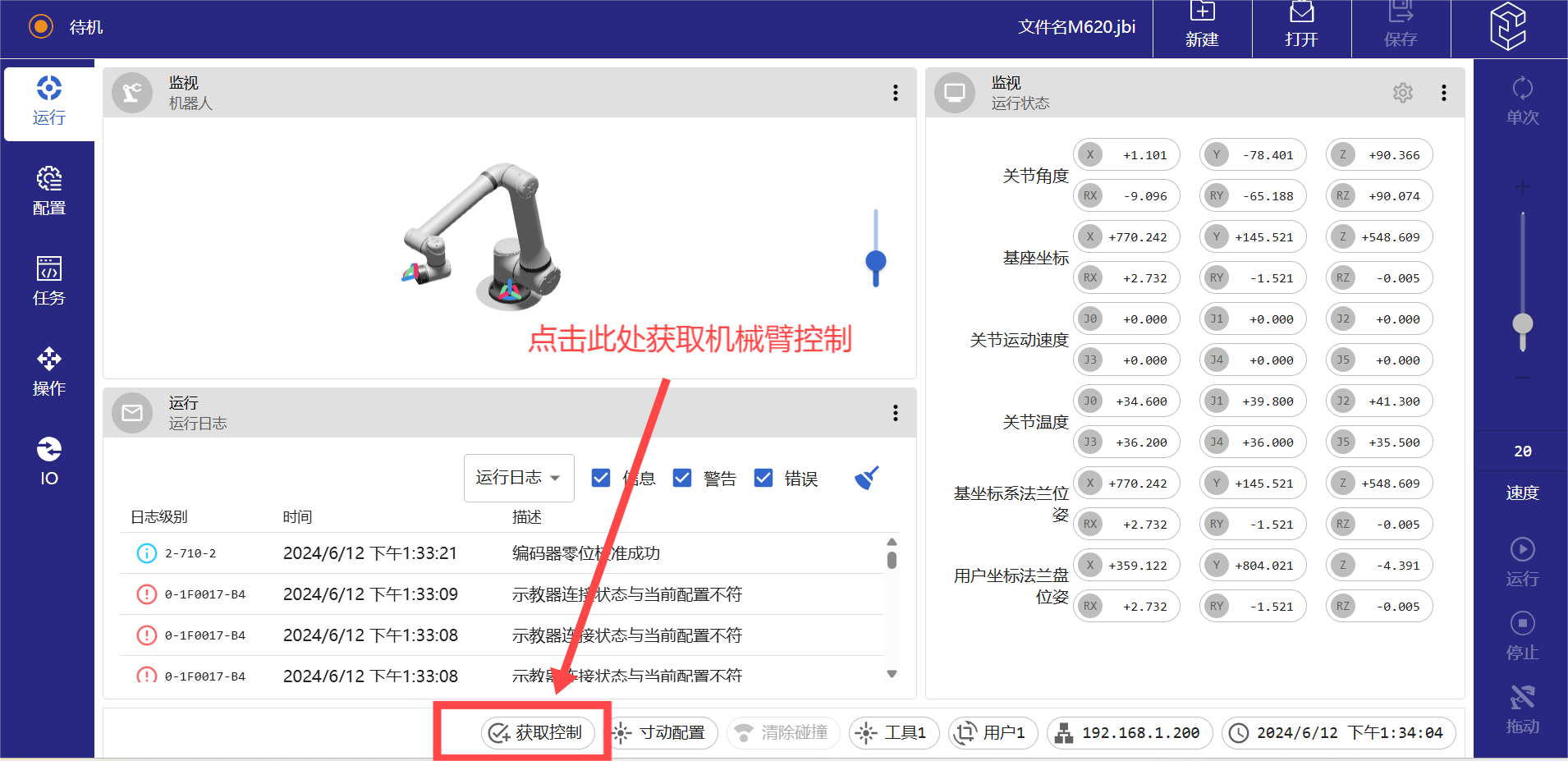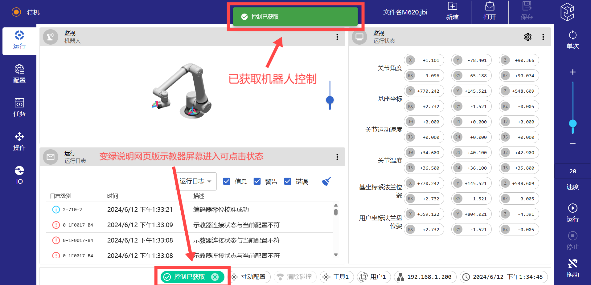 (5)進入網頁版示教器后,和另外兩種方法一樣,先點擊下方菜單欄里面的獲取控制按鍵,等待獲取控制按鍵從白色變為綠色后,即可操作網頁版示教器上面的操作界面。