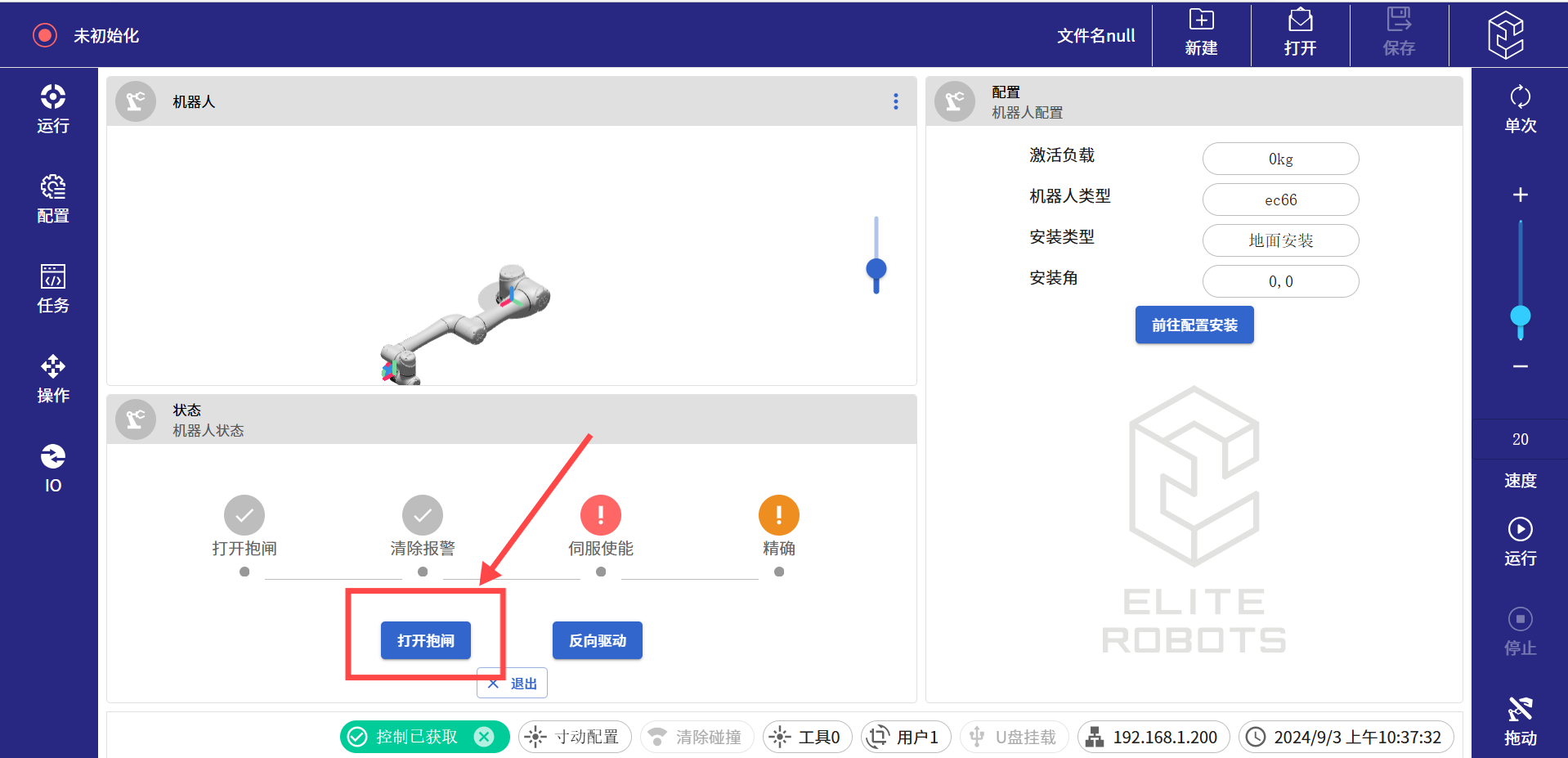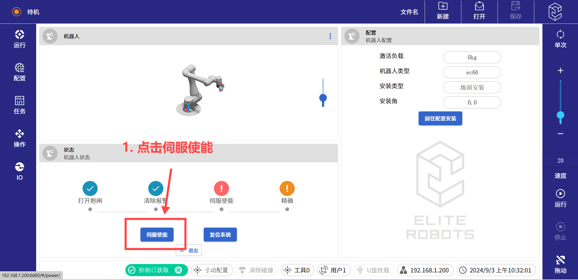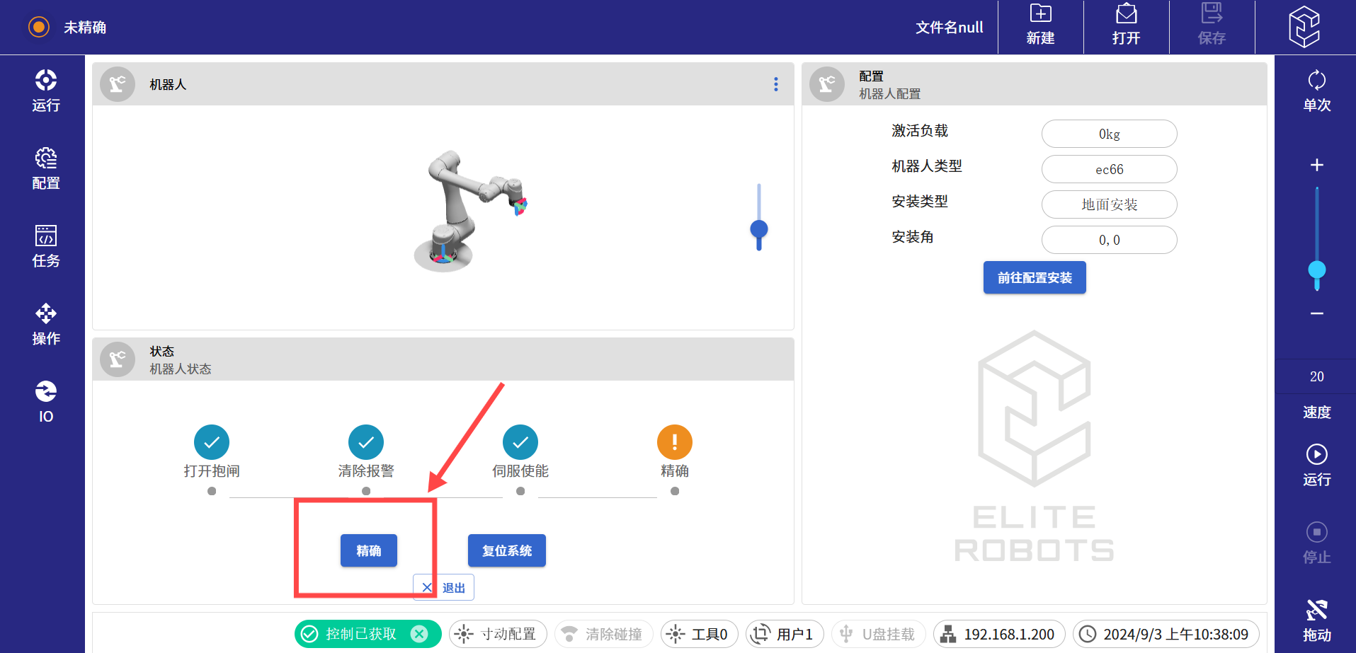 (8)進入待機界面后,依次點擊打開抱閘,伺服使能,以及精確。如果使用的是迷你控制柜,第一步還有一個機械臂上電的按鈕,點擊上電按鈕繼續往下執行即可。