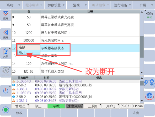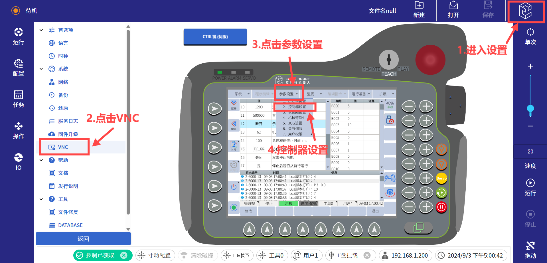 (5)如果機械臂報警提示“機械臂未進入遠程模式”或者“示教器連接狀態未斷開”需進行如下操作(示教器插頭已拔出)。進入網頁版示教器后,需點擊下方獲取控制按鈕,獲取機械臂控制權限,否則機械臂無法操作。然后點擊右上角的設置界面,打開VNC,然后點擊參數設置>控制器設置>示教器連接狀態,把示教器連接狀態改為斷開。