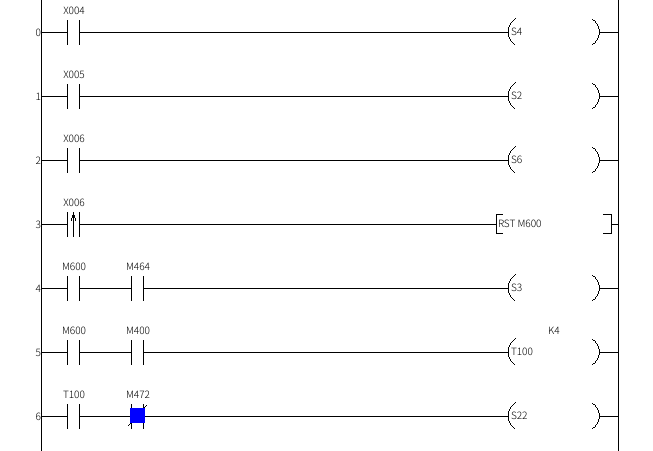 第 0 行:按下啟動(dòng)按鈕(X004)為“1”M601有信號(hào),M601關(guān)聯(lián)啟動(dòng)S1。