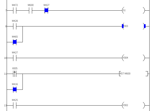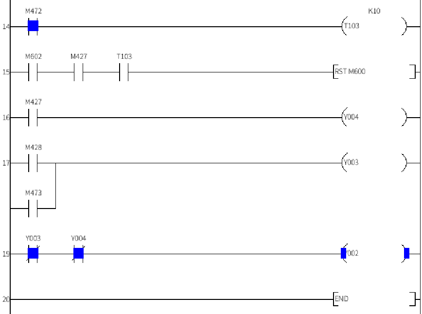 第 15 行:M602有信號(hào),M427(運(yùn)行狀態(tài))有信號(hào)且T103計(jì)時(shí)到達(dá)復(fù)位M600。